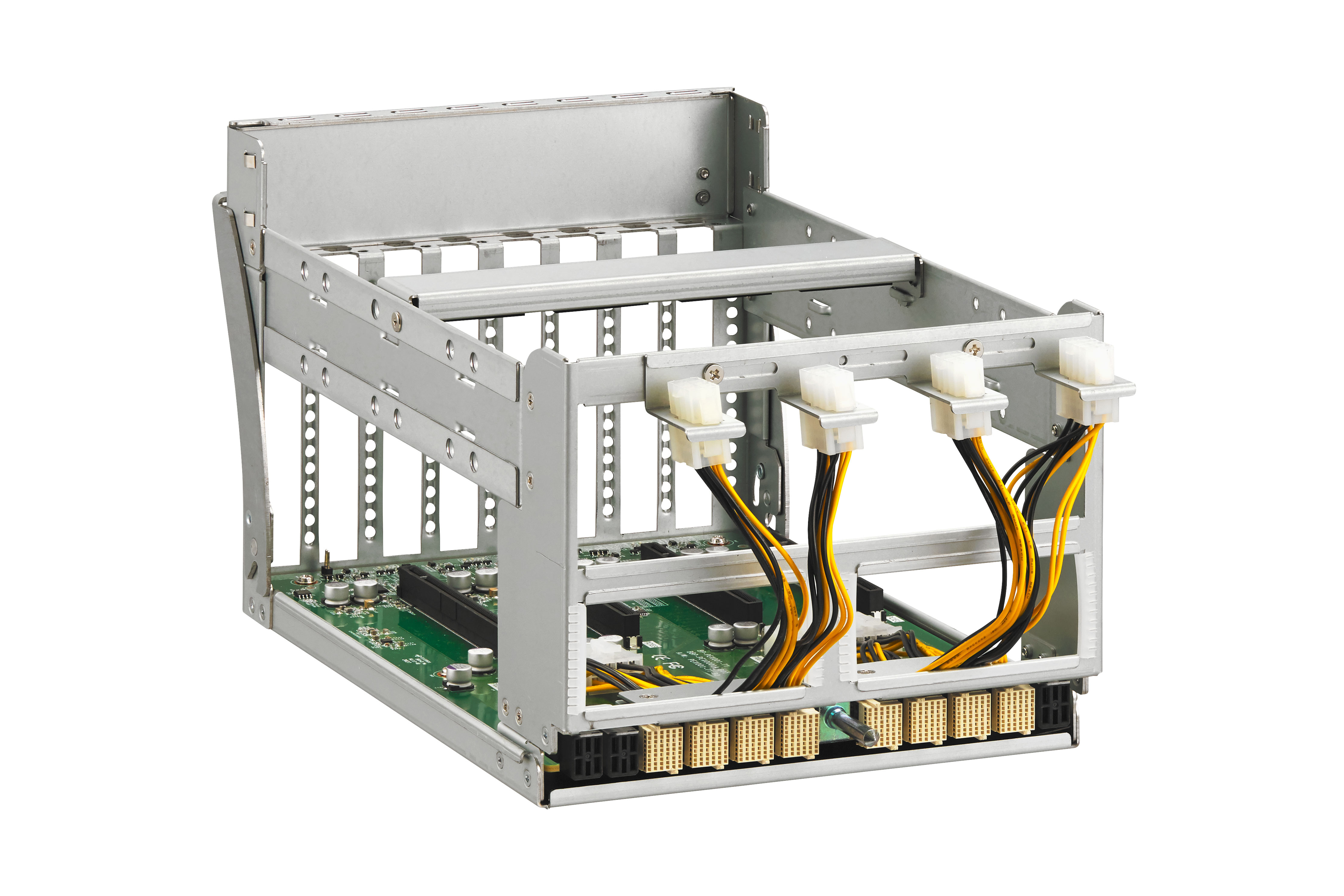 The extra double-width slot is configured into host port. Each host port is configured into four x4 host ports. The four GPUs can be allocated among the eight hosts.