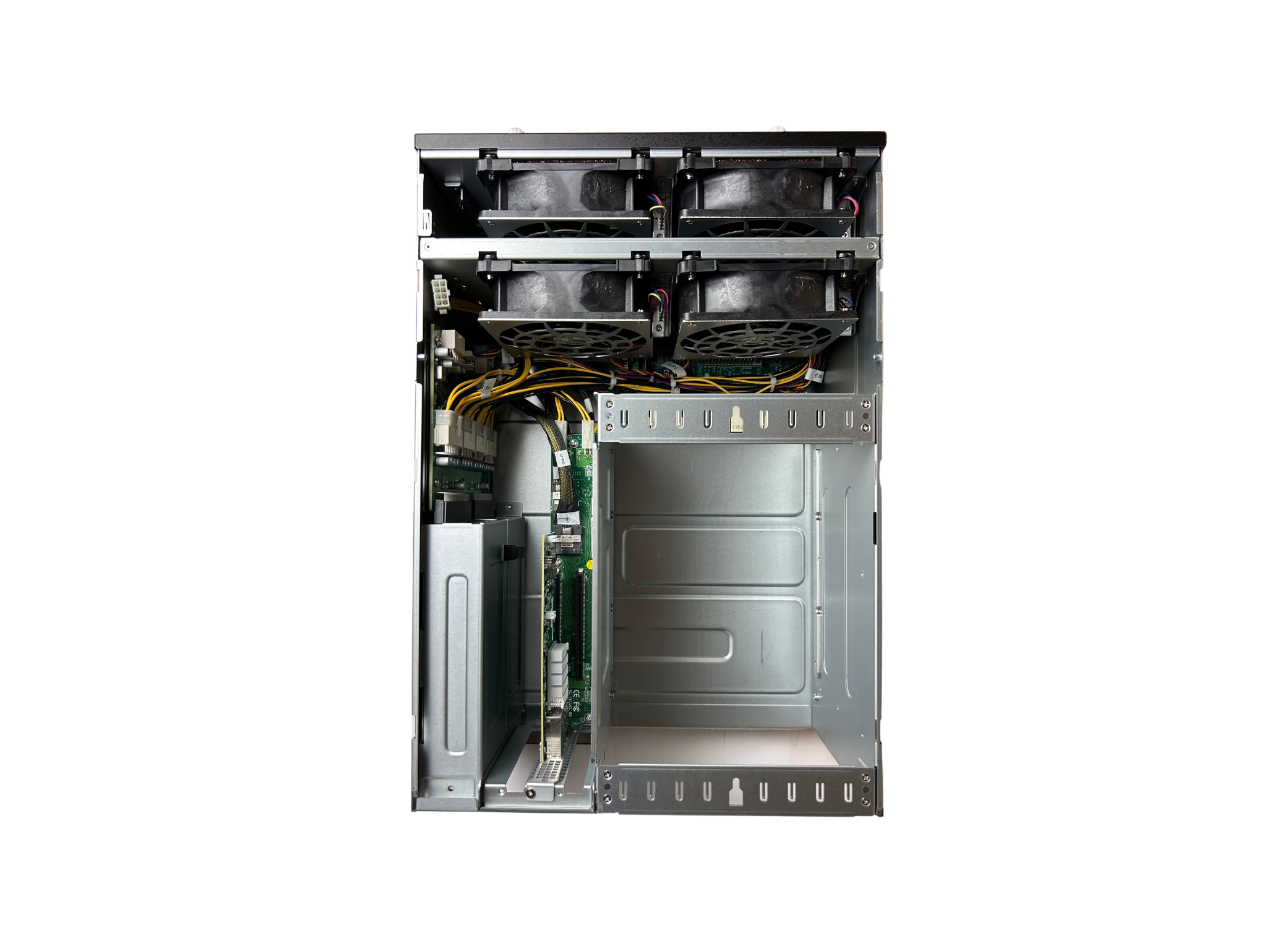 The extra double-width slot is configured into host port. Each host port is configured into two x8 host ports. The four GPUs can be allocated among the four hosts.
